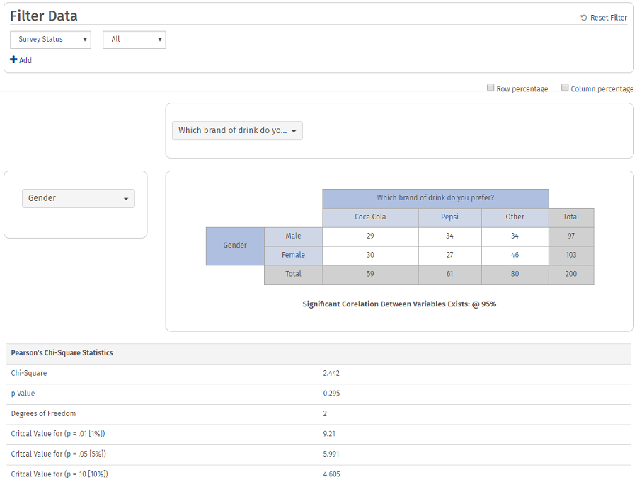 Pearson’s chi-square statistic is used to determine the goodness of fit between the two questions being correlated. In order to measure this, we need a null hypothesis. The null hypothesis measured using the cross-tab tool is that the two questions included in the cross-tab are correlated.