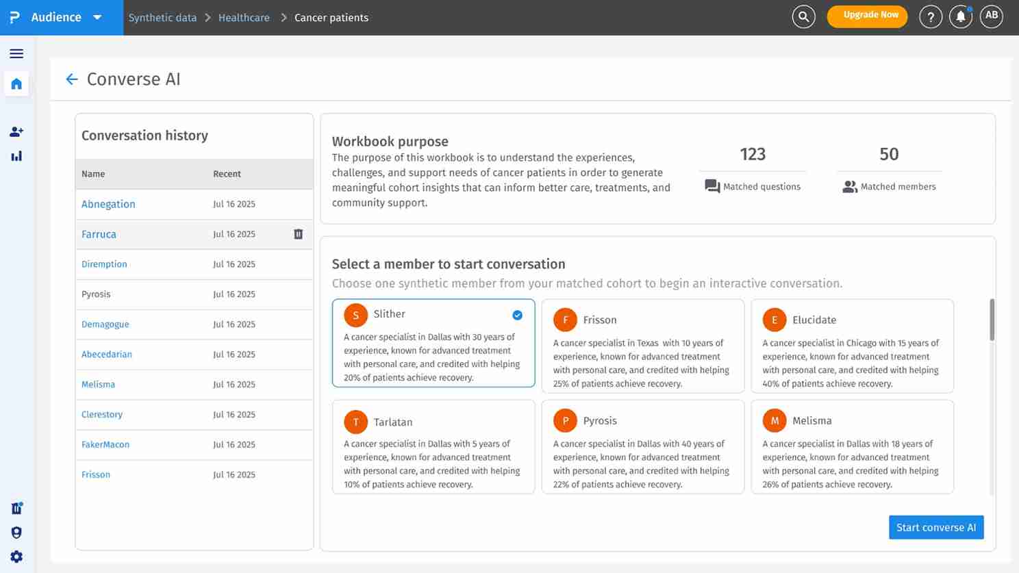 Converse AI lets you engage in dynamic, chat-based Q&A with synthetic personas inside the synthetic workbook, beyond static one-time questions. You can ask follow-up questions, keep conversation history, and export insights for deeper analysis.
