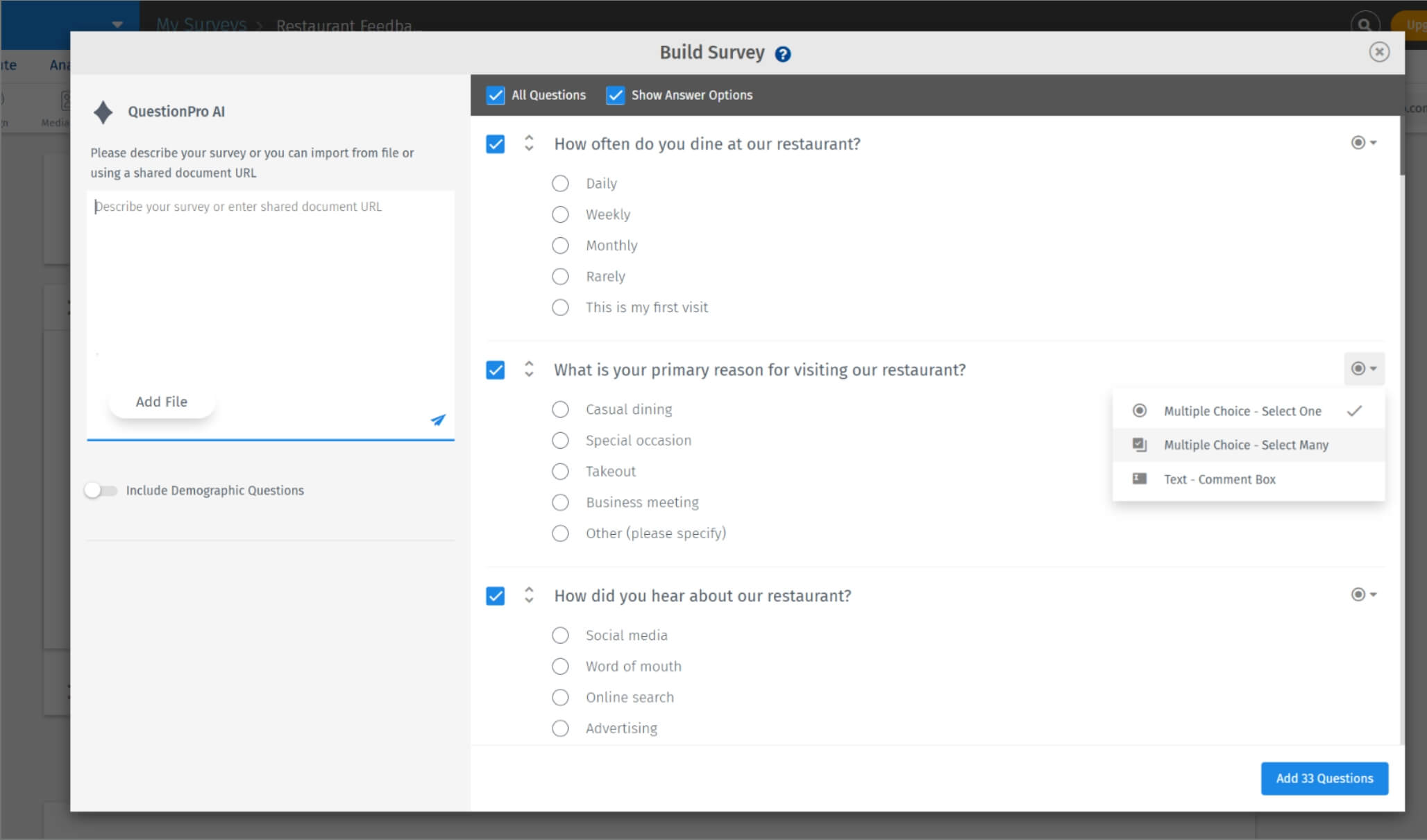 QuestionPro AI is QuestionPro’s innovative generative AI tool designed within our existing survey platform. Using a conversational interface to create surveys on any topic within seconds, you can build quick, creative surveys on any topic you are looking to research in as little as 60 seconds.