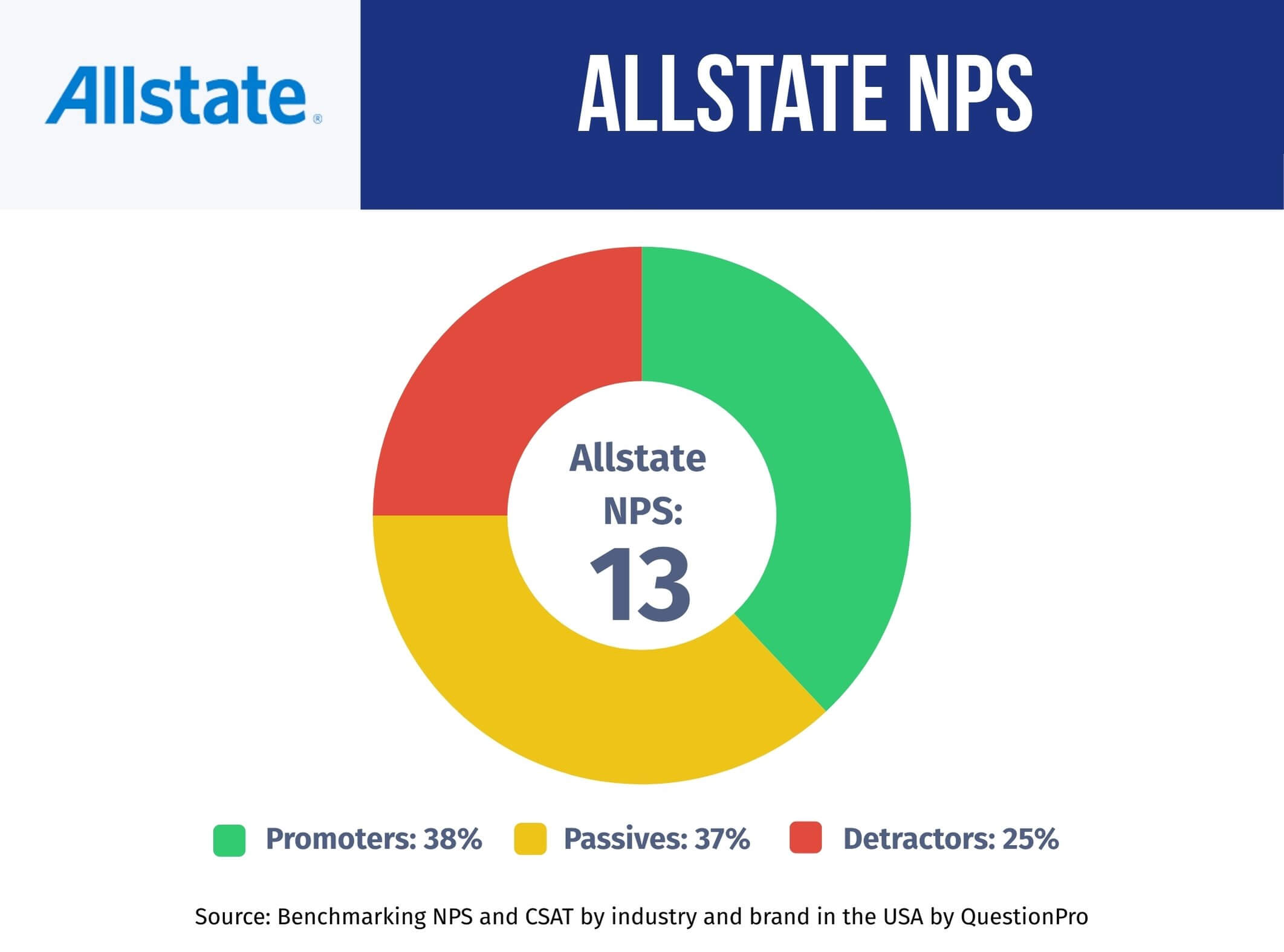 Allstate holds a Net Promoter Score (NPS) of 13, which is notably below the insurance industry average of 23, as reported in QuestionPro’s Q1 2025 Benchmarking NPS and CSAT Report. This score suggests that Allstate has room to grow in terms of customer loyalty and brand advocacy.