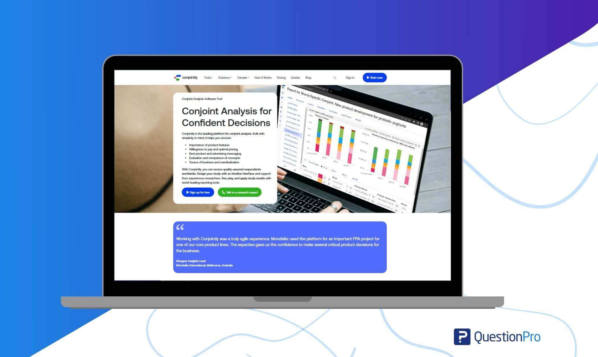| QuestionPro | Custom experiments, adaptive conjoint analysis, multi-channel data, analytics & reports | 4.5 | Pricing starts from $99 |
