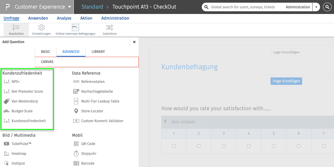 Die Customer Experience Management Plattform QuestionPro verfügt über einen einfach zu bedienenden Fragebogen-Editor, mit dem Sie schnell, einfach und intuitiv Kundenbefragungen für Ihre Touchpoint Analysen erstellen können. Hierbei stehen Ihnen vordefinierte Frage-Sets zur Verfügung, die Sie einfach per Mausklick auswählen und dem Fragebogen hinzufügen können. Solche vordefinierten Frage-Sets sind etwa Net Promoter Score, Customer Effort Score, van Westendorp Price Sensitivity Meter, Conjoint Analyse, TURF Analyse und viele mehr.