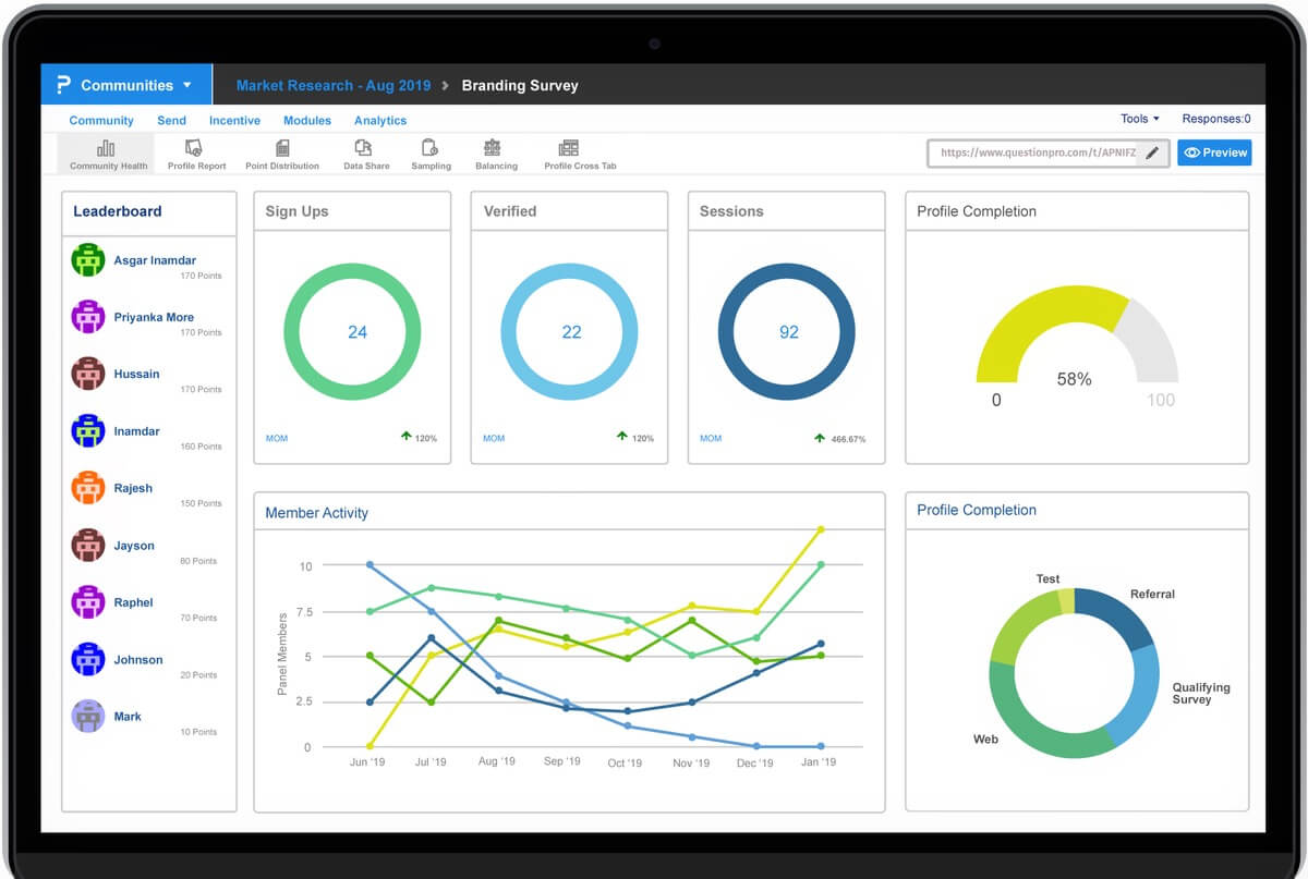 Die QuestionPro Online Community Plattform verfügt über eine Vielzahl von Features und Funktionen für das Anwerben von Mitgliedern, für mehr Engagement, Sammlung von Feedback und Daten, für die Incentivierung von Mitgliedern und zur Analyse.