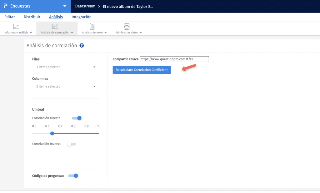 - Haz clic en Recalcular coeficiente de correlación para obtener un nuevo informe de correlación.