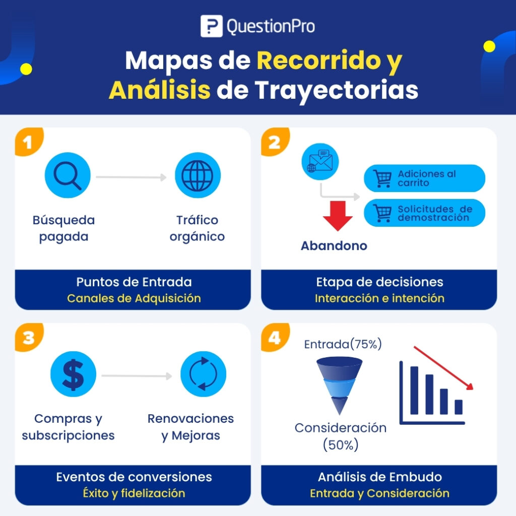 El análisis de rutas muestra las secuencias más comunes, mientras que el análisis de embudo resalta dónde disminuyen las tasas de conversión.