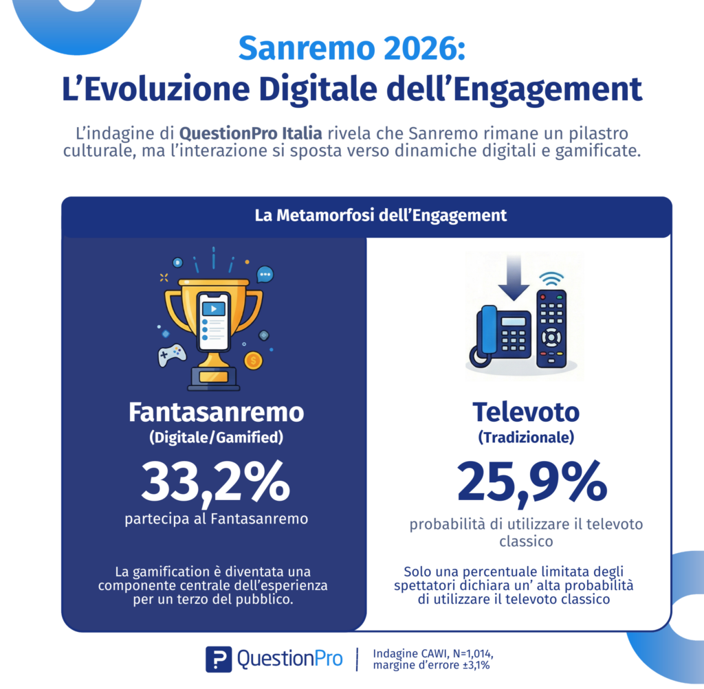Oltre 1.000 italiani intervistati in un’indagine nazionale esclusiva condotta da QuestionPro Italia. Dalle previsioni sul vincitore alla rivoluzione digitale dei The Jackal, passando per il Fantasanremo e i temi sociali che ci aspettiamo dal palco dell’Ariston: ecco la fotografia completa del paese a pochi giorni dall’inizio del Festival.