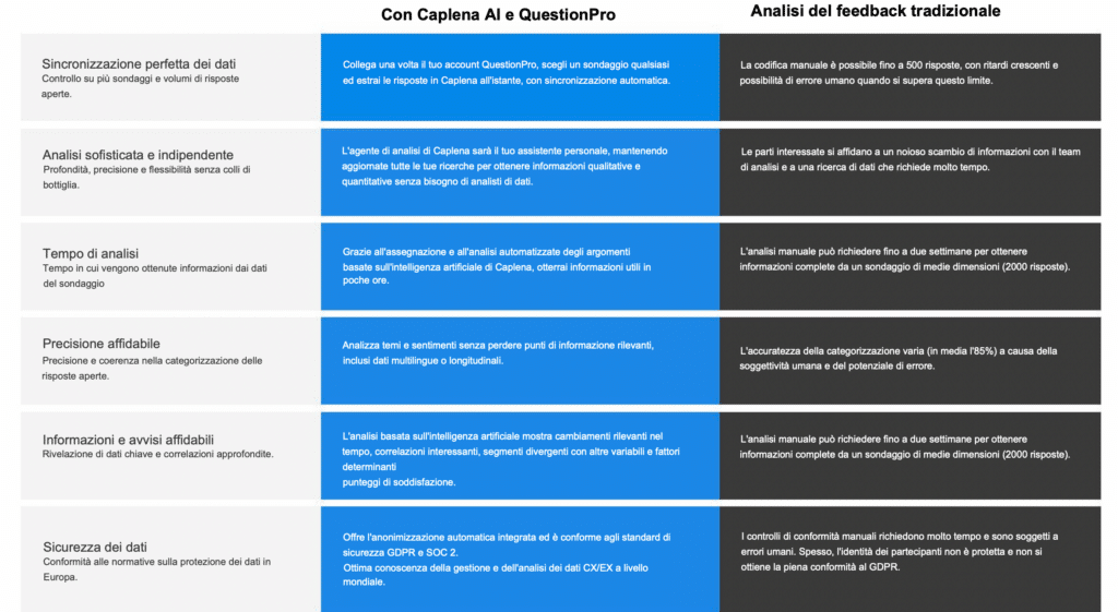 L’uso delle nuove tecnologie rappresenta un vantaggio competitivo in ogni aspetto della ricerca. In questa tabella è possibile confrontare i vantaggi delle piattaforme QuestionPro potenziate dall’IA di Caplena rispetto ai processi tradizionali: